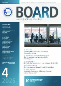 Die BOARD aus dem Hause Bundesanzeiger Verlag in Kooperation mit der AdAR (Arbeitskreis deutscher Aufsichtsrat e.V.) unterstützt Aufsichtsräte bei der Ausgestaltung ihres Mandates und bietet eine effiziente und flexible Fortbildung zu unternehmens- und branchenspezifischen Fachthemen. Die Zeitschrift erschließt relevante Themen und fördert den Erfahrungstransfer von Experten. Mit dem BOARD erhalten die Leser einen umfassenden Überblick über aktuelle Entwicklungen und Herausforderungen im Bereich der Aufsichtsratsarbeit. Relevante Aufsätze, Beiträge von Kollegen und Rechtsprechungshinweise vermitteln aktuelles Fortbildungswissen effizient, leicht verständlich und praxisbezogen. Der Informationsdienst bietet: