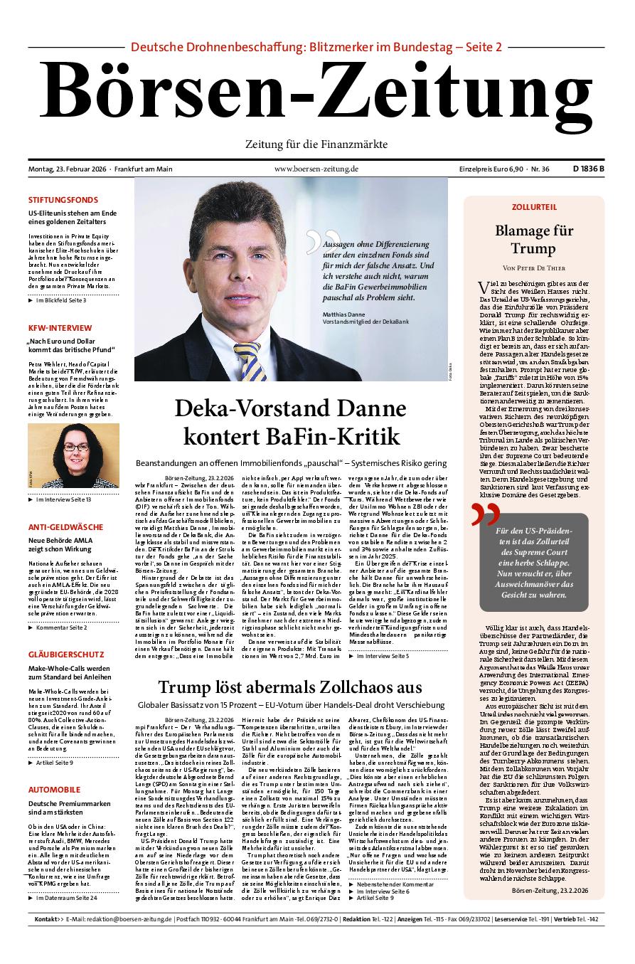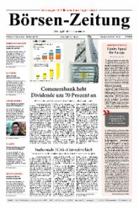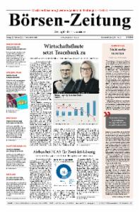 Die Börsen-Zeitung richtet ihren Fokus auf die Bereiche Finanzmärkte, Unternehmensberichte und Kreditwirtschaft. Sie erscheint 5mal wöchentlich von Montag bis Freitag.
