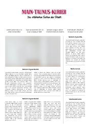 Volltext der Tageszeitung "Main-Taunus-Kurier" seit dem 02.01.2002. Zum 31.3.2019 wurde der "Main-Taunus-Kurier" eingestellt, der "Wiesbadener Kurier" erscheint seitdem mit erweitertem Main-Taunus-Teil.